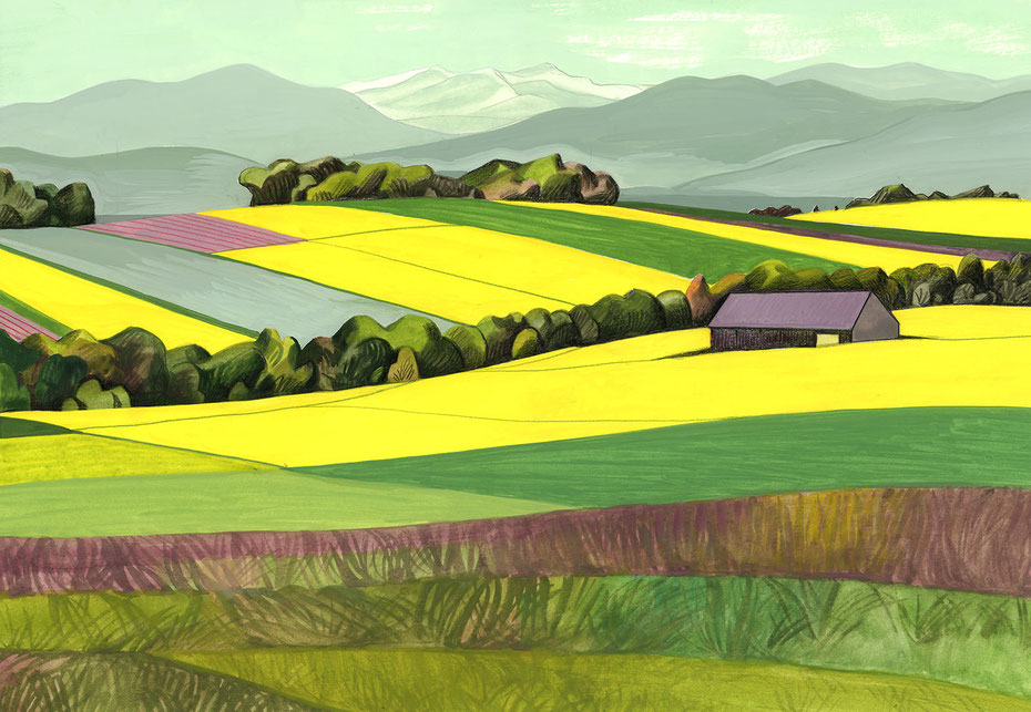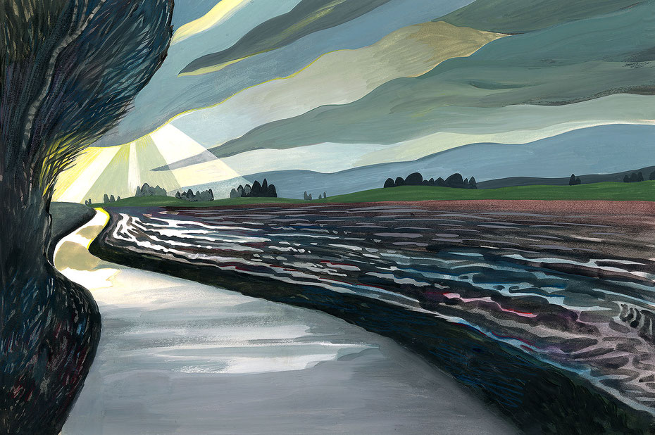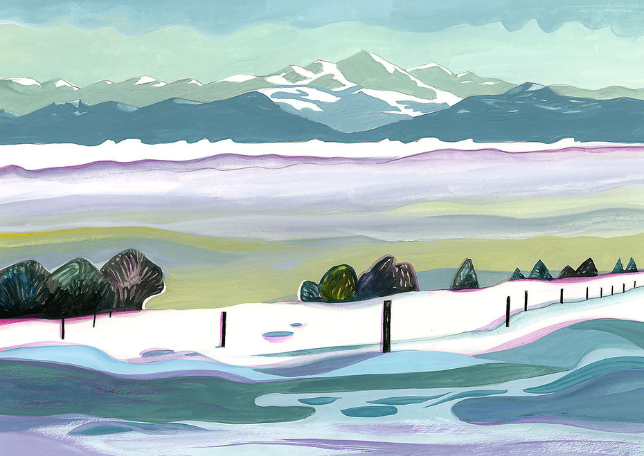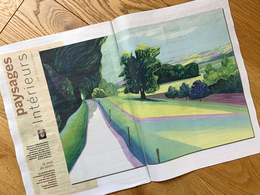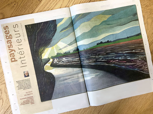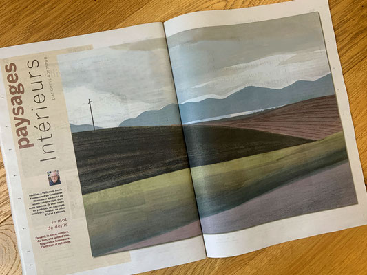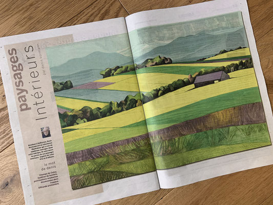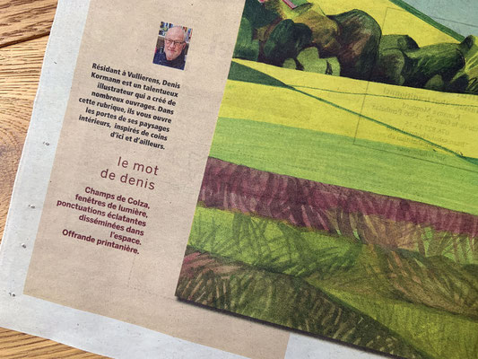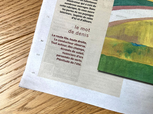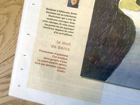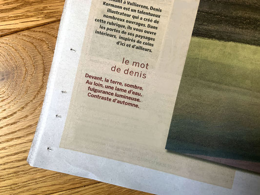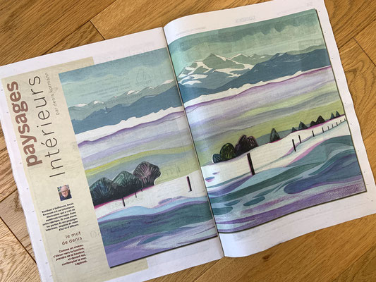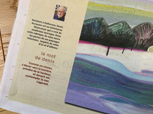 Tous les deux mois, j'ai le plaisir de retrouver les lectrices et lecteurs du journal pour une immersion en double-pages dans une image inspirée des paysages d'ici ou d'ailleurs. L'illustration, accompagnée de quelques mots, quelques lignes, se veut une parenthèse, une respiration esthétique et poétique à même de transporter les gens et de les faire rêver, l'espace d'un instant.