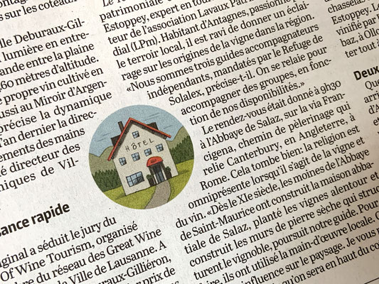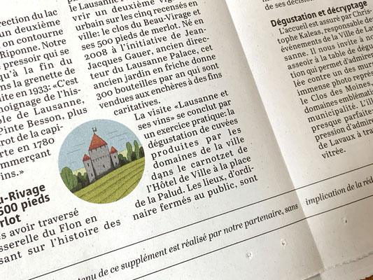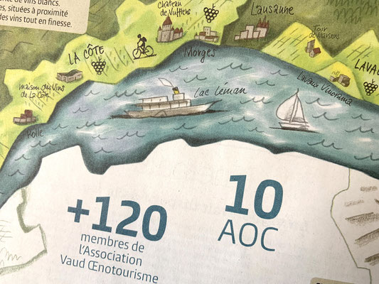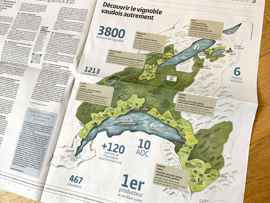 Encarté dans le quotidien Le Temps du week-end, il y avait ce supplément - Oenotourisme: les trésors vaudois - pour lequel j'ai eu le grand plaisir de créer à la fois la carte du canton et ses différentes régions viticoles et les vignettes thématiques qui accompagnaient les différents chapitres.